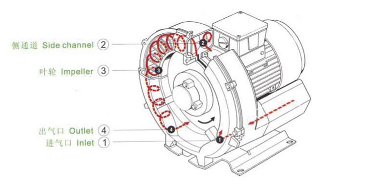 當(dāng)葉輪轉(zhuǎn)動(dòng)時(shí),由于離心力的作用,風(fēng)向標(biāo)促使氣體向前向外運(yùn)動(dòng),從而形成一系列螺旋狀的運(yùn)動(dòng)。葉輪刀片之間的空氣呈螺旋狀加速旋轉(zhuǎn)并將泵體之外的氣體擠入(由吸氣口1吸入)側(cè)槽,當(dāng)它進(jìn)入側(cè)通道2以后,氣體被壓縮,然后又回復(fù)到葉輪刀片間再次加速旋轉(zhuǎn)。當(dāng)空氣沿著一條螺旋形軌道穿過(guò)葉輪和側(cè)槽時(shí),每個(gè)葉輪片增加了壓縮和加速的程度,隨著旋轉(zhuǎn)的進(jìn)***體的動(dòng)能增加,使得沿側(cè)通道通過(guò)的氣體壓力進(jìn)一步增加。當(dāng)空氣到達(dá)側(cè)槽與排放法蘭的連接點(diǎn)(側(cè)通道在出口處變窄),氣體即被擠出葉片并通過(guò)出口消聲器排出泵體。