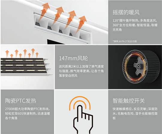 陶瓷PTC加熱,通過(guò)不斷循環(huán)來(lái)提高浴室溫度,送熱極為均勻。2700W大功率, 雙核動(dòng)力,高制熱量系統(tǒng)設(shè)計(jì),使發(fā)熱效率更高,熱損耗更低。高制熱,快速溫暖空間, 不僅讓您暢享沐浴時(shí)光,即便在洗漱更衣區(qū)也可享受溫暖。