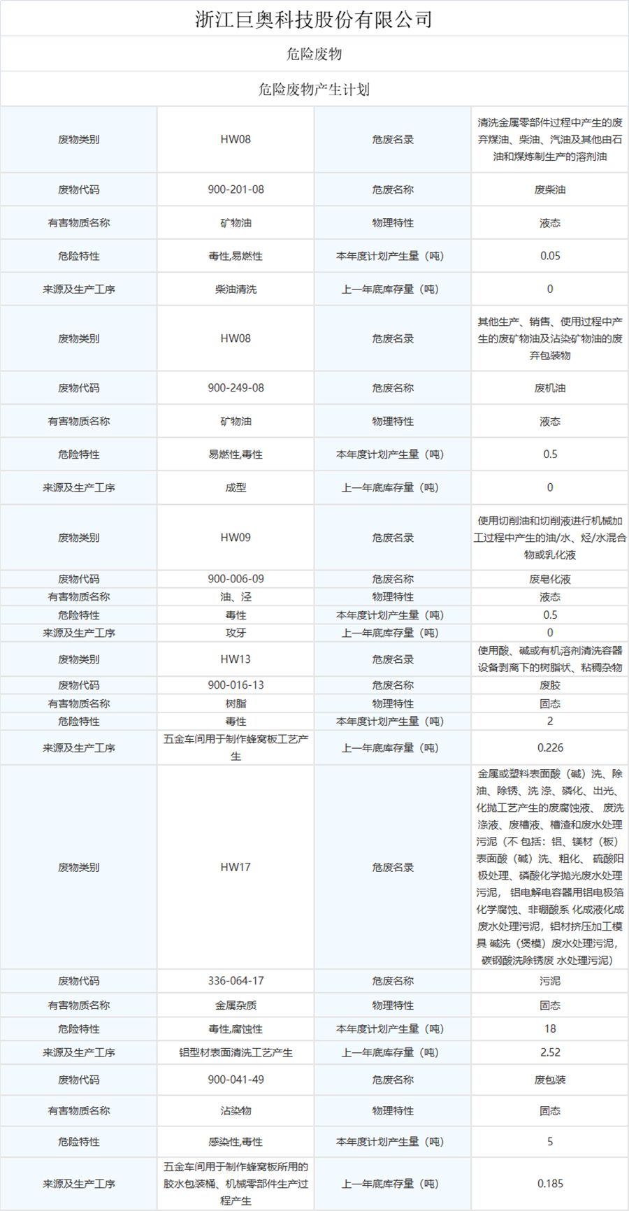 公示通知丨浙江巨奧科技股份有限公司生產廢物處置事項